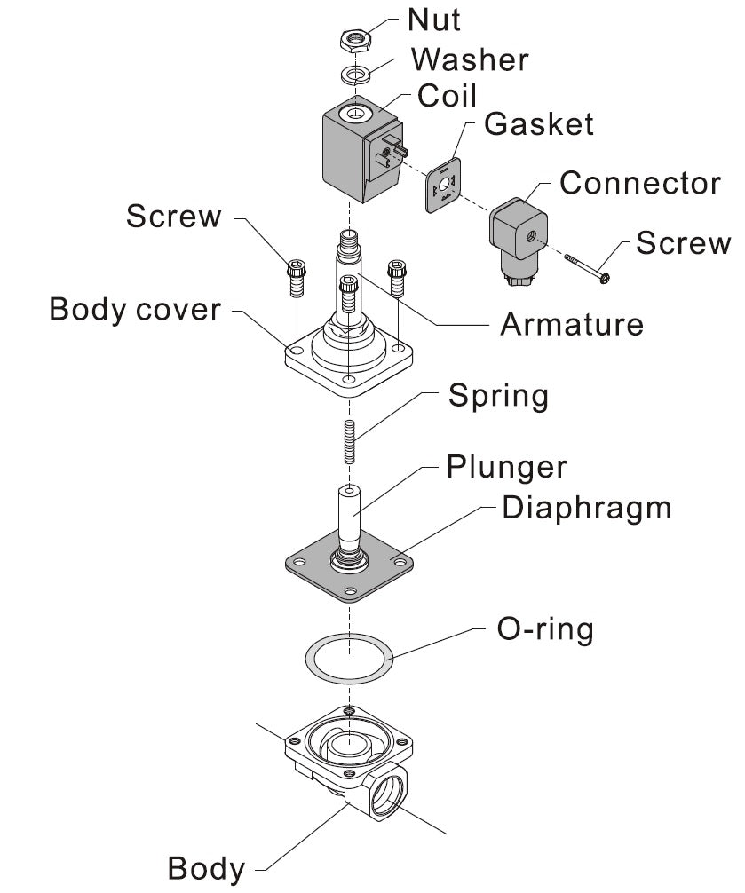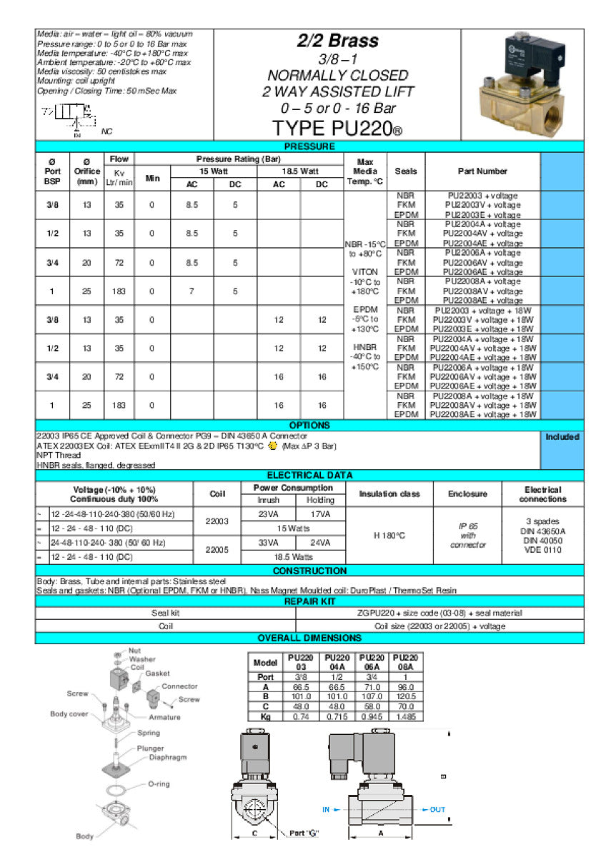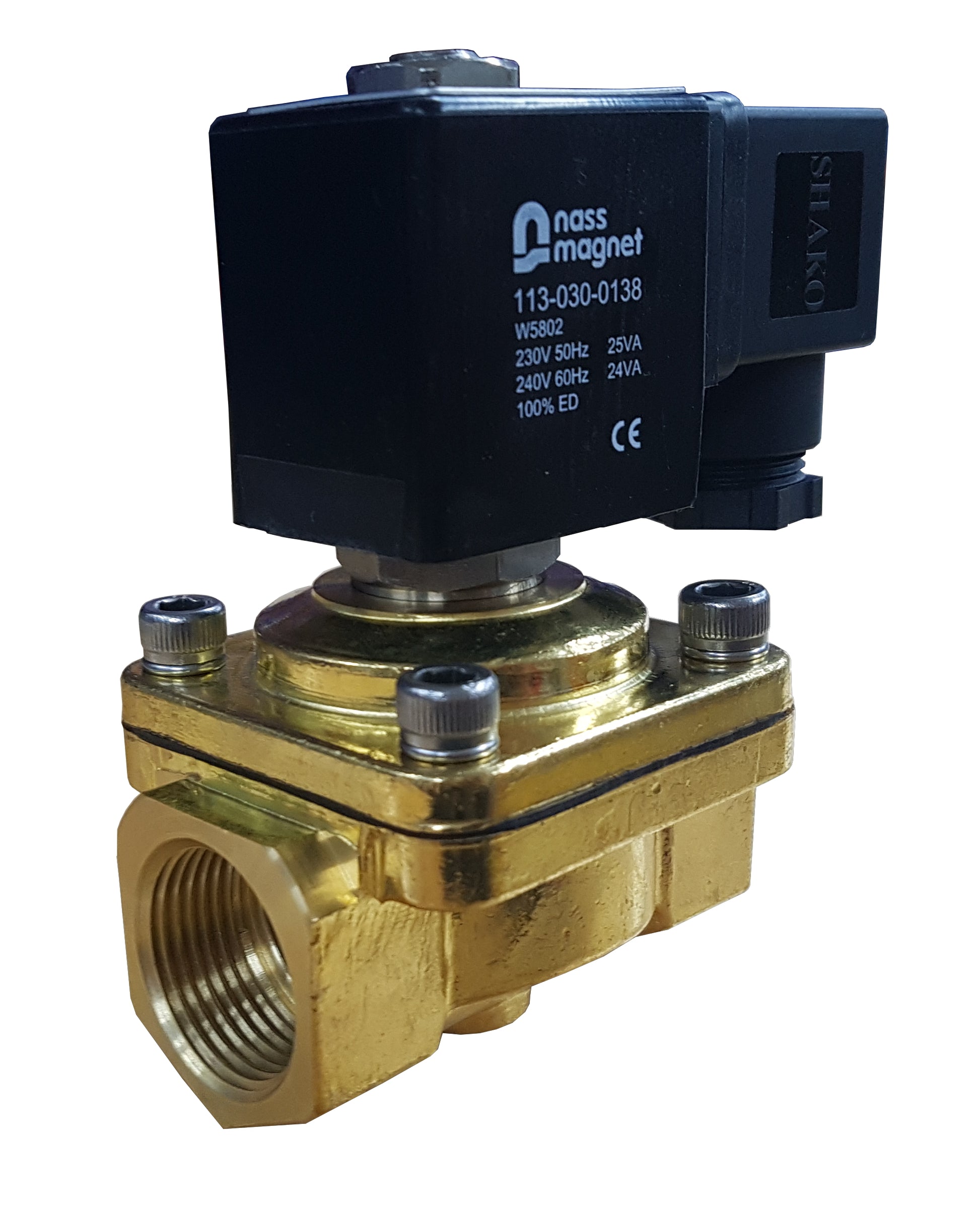 Function: 2/2 way normally closed Operation: assisted lift (zero-rated) Port: 3/4 BSP, option NPT thread Body: Brass Pressure: 80% Vacuum (-0.8 Bar) to 12 Bar (Not suitable for pressures between -0.1 Bar and +0.1 Bar) Internals: stainless steel Seals: NBR standard, option EPDM, Viton and HNBR Orifice: 20.0 mm Kv flow factor: 72 L/min based on water with 1 Bar pressure difference. Media: air, water, vacuum, oil, LPG, diesel, petrol, propane, inert gases, nitrogen, carbon dioxide, argon, oxygen, antifreeze, glycol, kerosene and other fluids under 50 CST and gases compatible with materials of construction. Media temperature: NBR -15°C to +80°C, Viton -10°C to +180°C, HNBR -40°C to +150°C, EPDM -5°C to +130°C. Coil: 18.5 Watt Nass Magnet Class H CE IP65 approved 100% duty rated DIN43650A Protection: IP65 with connector (Included) Coil option: ATEX EExmIIT4 Temperature Class T4 T130°C Ex mb IIC T4 and Gb Ex mb tb IIIC T130°C Db for hazardous area 21 and 22 with max media temperature +80°C and pressure 3 Bar Max. Voltages: 12vDC, 24vDC, 48vDC, 110vDC, 220vDC or 12vAC, 24vAC, 36vAC, 48vAC, 110vAC, 230vAC or 380vAC 50/60hz.